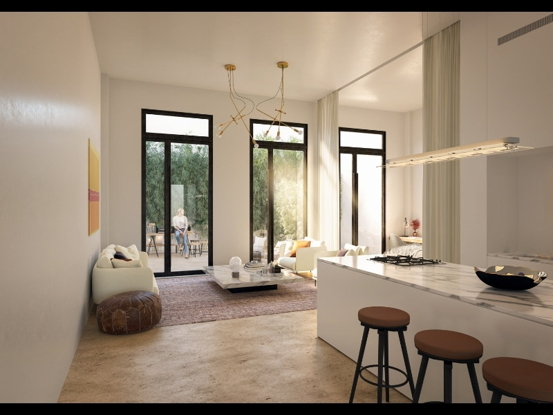 Estas unidades de doble altura disponen de una gran luminosidad facilitada por su excepcional volumetría, plantas abiertas y aventanamientos. En estas unidades se aplicaron modernos pisos de microcemento color ocre.