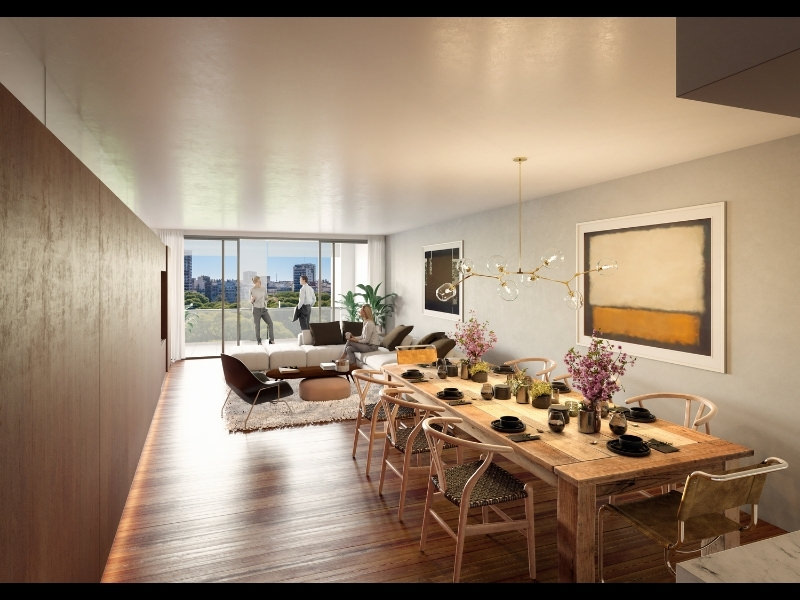 El living y el comedor comparten un espacio apaisado que se proyecta a la plaza mediante el ancho y traslúcido balcón protegido por una piel de cristal. Los pisos son entablonados en lapacho hidrolaqueado. Todos cuentan con impresionantes vistas a la plaza y luz en ambos frentes.